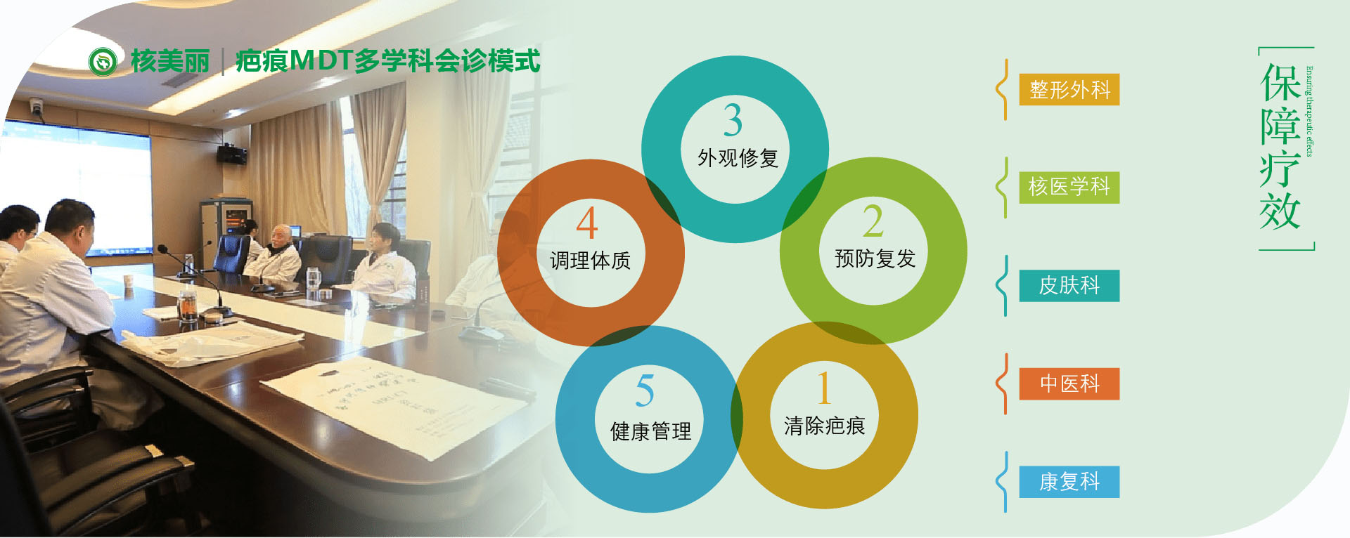 MDT多学科会诊是以整合医学理念,追求健康无痕,将现代医学中整形外科、皮肤科、核医学科、放射治疗科、营养科、中医科融合,由相应领域专家共同为疤痕患者制定个性化最佳治疗方案,最后结合社会心理-医学,生活模式,让疤痕患者实现全疤痕周期医学生活健康管理,从而达到天下无疤的理念。