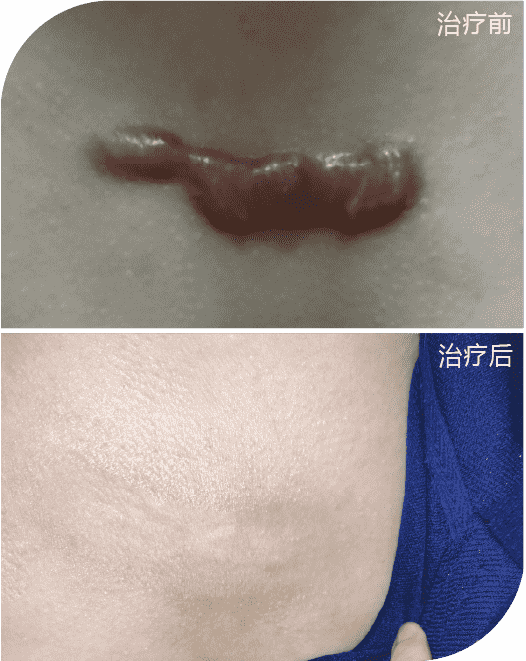 患者近年来疤痕持续扩散增长,痛痒明显,多地求医未果。经朋友介绍来我中心就诊,疗程修复后疤痕恢复平整未复发。