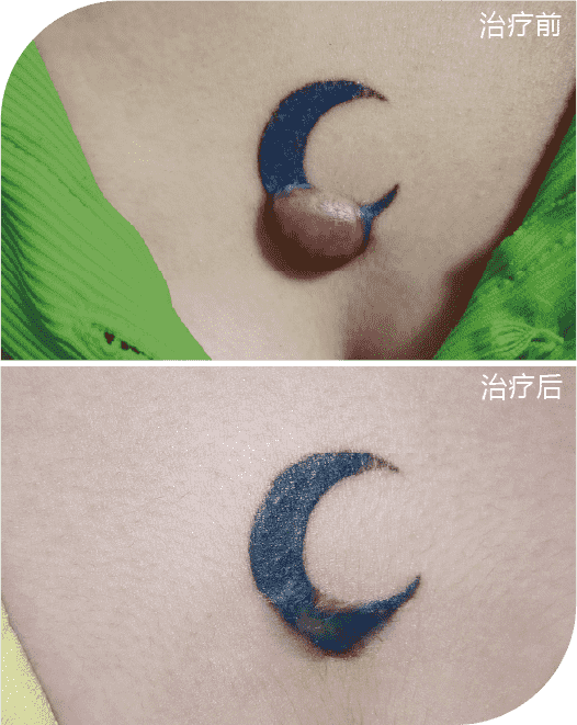 患者胸前疤痕疙瘩开始很小,企图用纹身来掩盖,结构疤痕疙瘩不断生长,患者不得已来到本中心治疗,几个疗程后,疤痕疙瘩没了。
