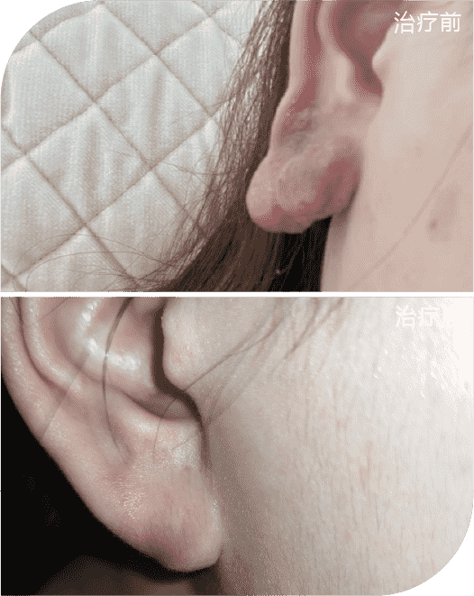 打耳洞后患者长出疤痕疙瘩,在当地医院单纯手术切除后反而造成刺激,形成句型疙瘩,来我中心采用手术+康复发治疗,得到根治!