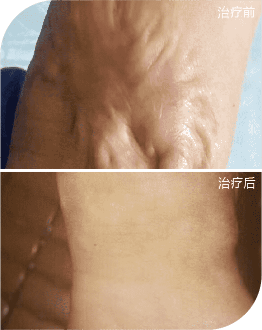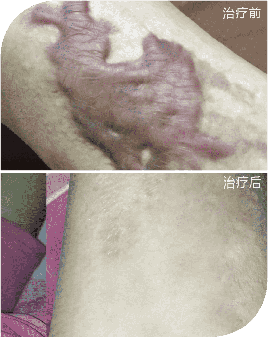 多年前不慎被烫伤,小腿部疤痕严重增生、红肿、痛痒,天气不好的时候半夜经常痒醒,来我中心经过综合多技术治疗,疤痕恢复平坦!